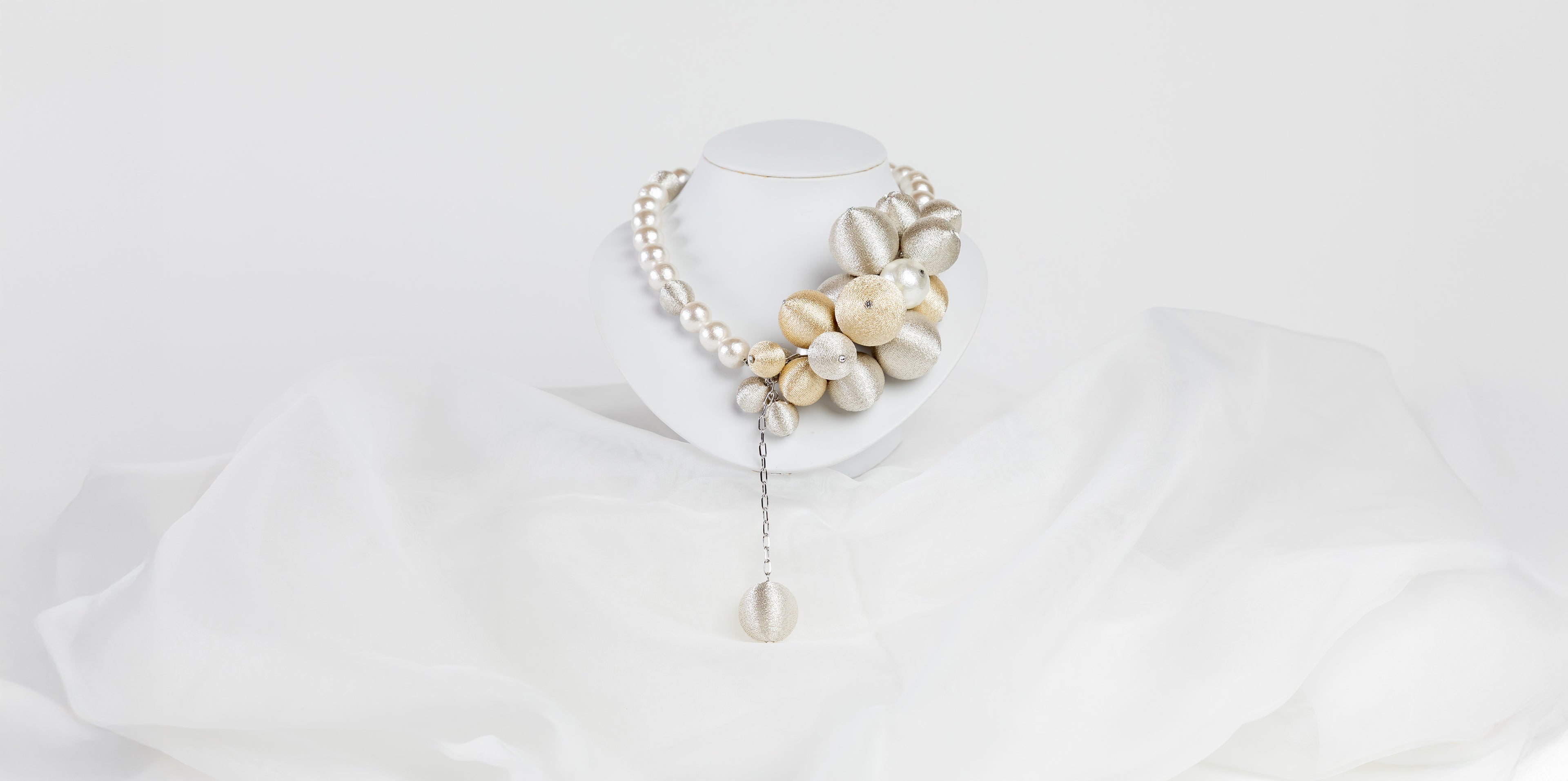 華やかさと上品さを兼ね備えたパーティーネックレス。シャンパンゴールドとシルバーの大ぶりな糸玉を贅沢にあしらい、存在感のあるデザインに仕上げています。